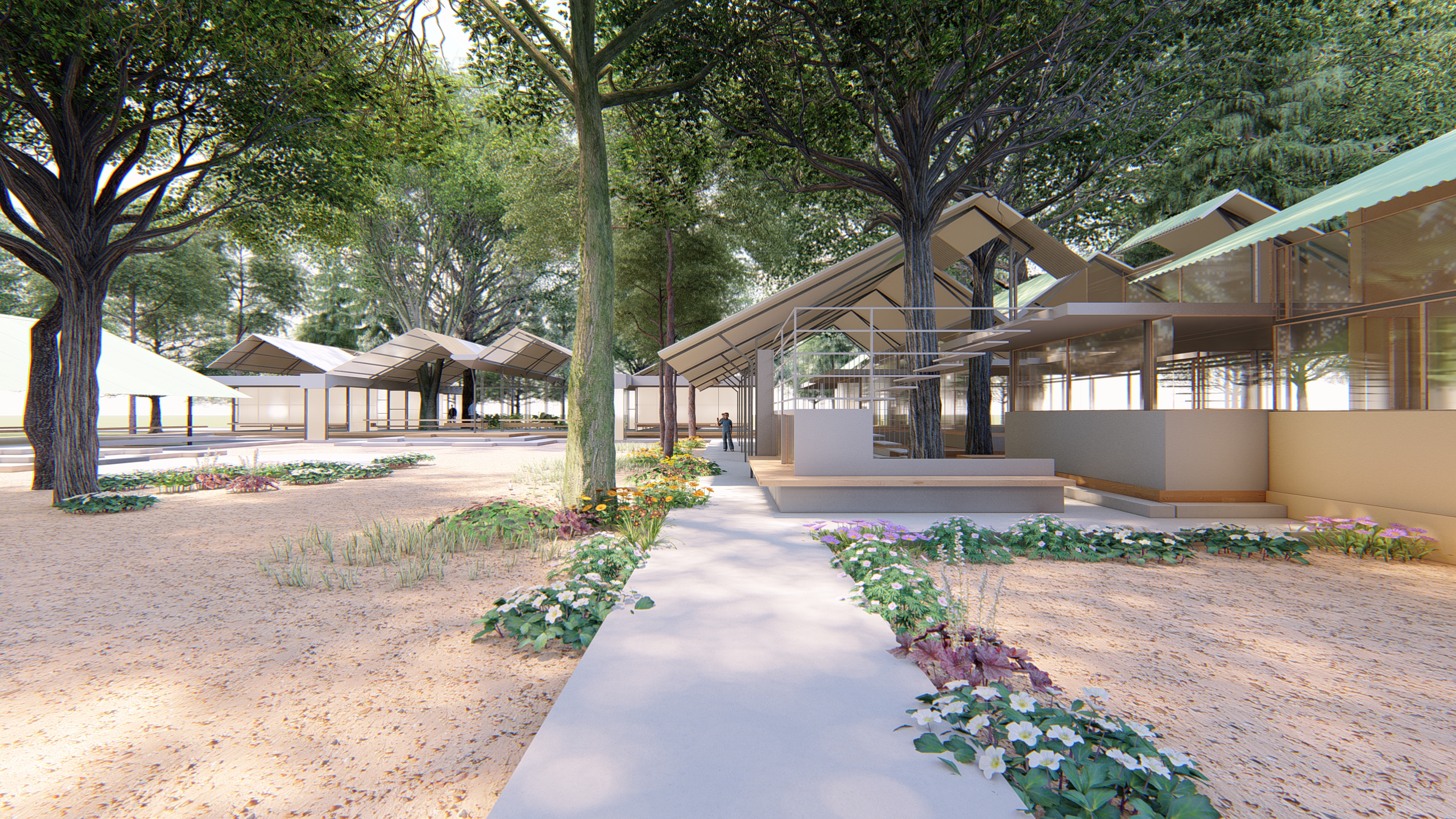 The overall structure is made of steel, such that it can be long-lasting but at the same time can be dismantled easily and recycled after the lifespan of the programme is completed, such as to restore the site to its original state without environmental damage. For this, the structures are proposed to be raised above the ground such that the ground remains undisturbed. The raised structures will have a flooring of recycled precast concrete, and the walls will be made of stabilised mud blocks. The roof is made up of insulated Galvalume sheets. Provisions of water harvesting and solar panels will be made to ensure saving of water and energy. The landscape will comprise of indigenous plants that maintain the aesthetic of the wilderness of the site.